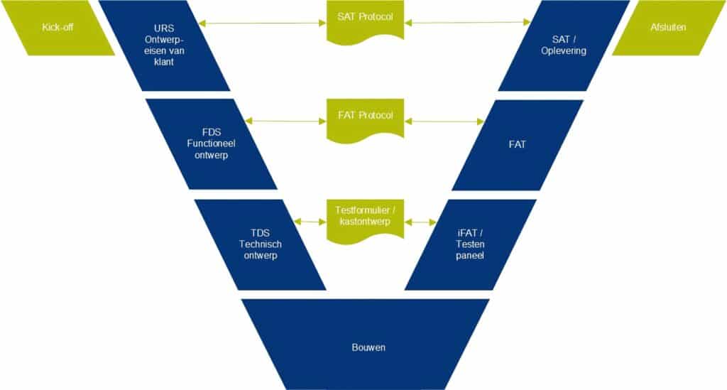 EKB werkt volgens het V-model waarbij diverse fases worden uitgevoerd totdat het project is voltooid. Het V-model is hieronder schematisch weergegeven. Aan de linkerzijde staan de fases van de ontwikkeling, terwijl de rechterzijde de validatiefases toont. In de punt komen deze twee fases samen in de bouwfase.